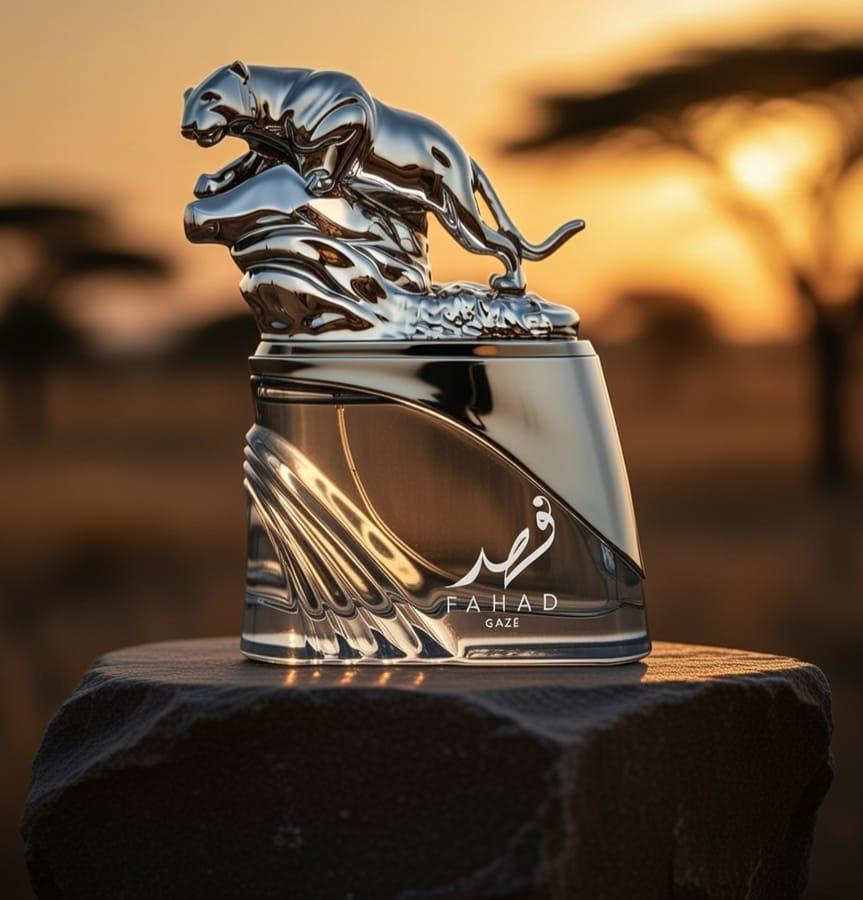 Fahad Gaze by Arabiyat Prestige is a Woody Spicy fragrance for men. This is a new fragrance. Fahad Gaze was launched in 2025. The nose behind this fragrance is Julia Rodriguez. Top notes are Metallic notes, Spicy Notes and elemi; middle notes are Orange Blossom, Patchouli and Incense; base notes are Vanilla, Ambergris and Moss.