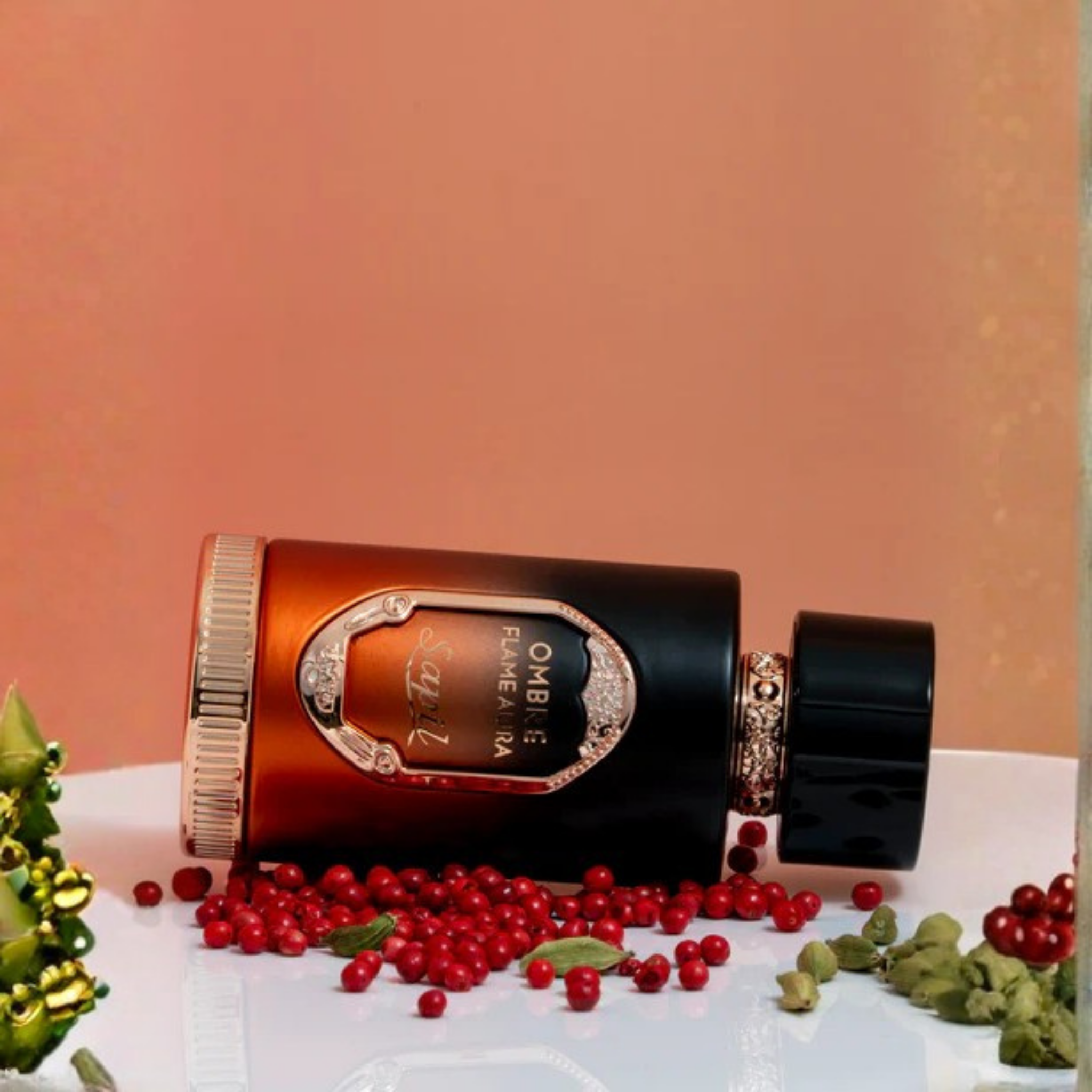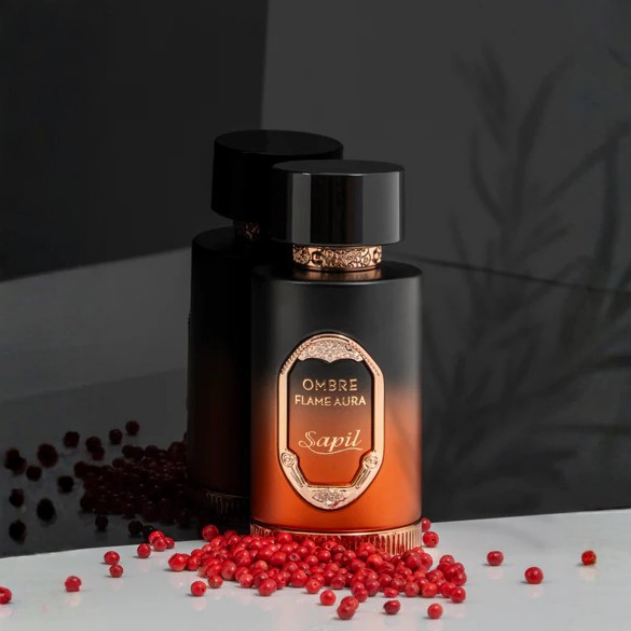 Ombre Flame Aura is a dynamic and captivating fragrance, evoking the fierce intensity of a burning flame. The fiery combination of cardamom, pink pepper, and rosemary opens the scent with a burst of energy, while the deep, smoky heart of sandalwood, oud, and patchouli creates a powerful, lasting impression. The vanilla and tonka base adds a warm, sensual finish.