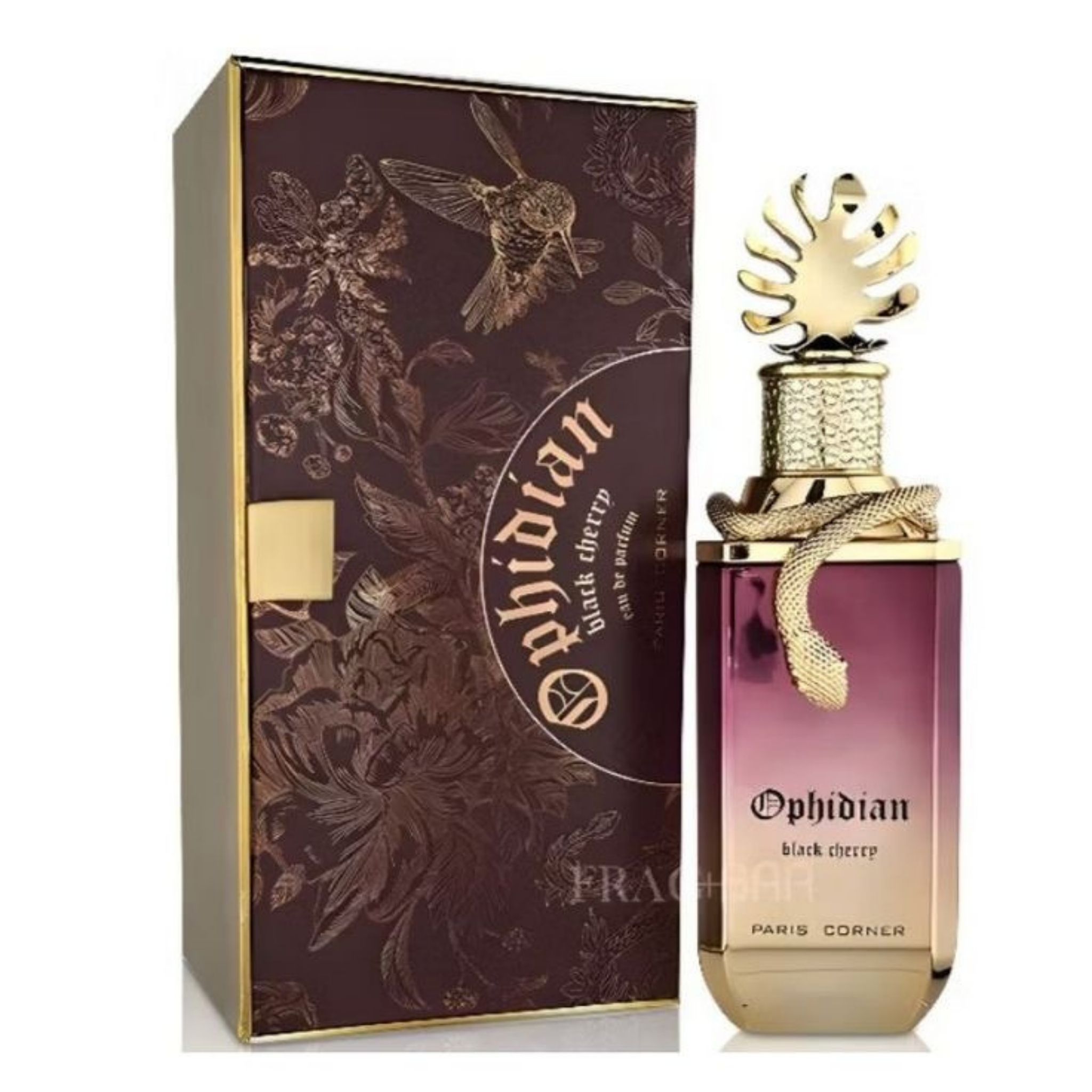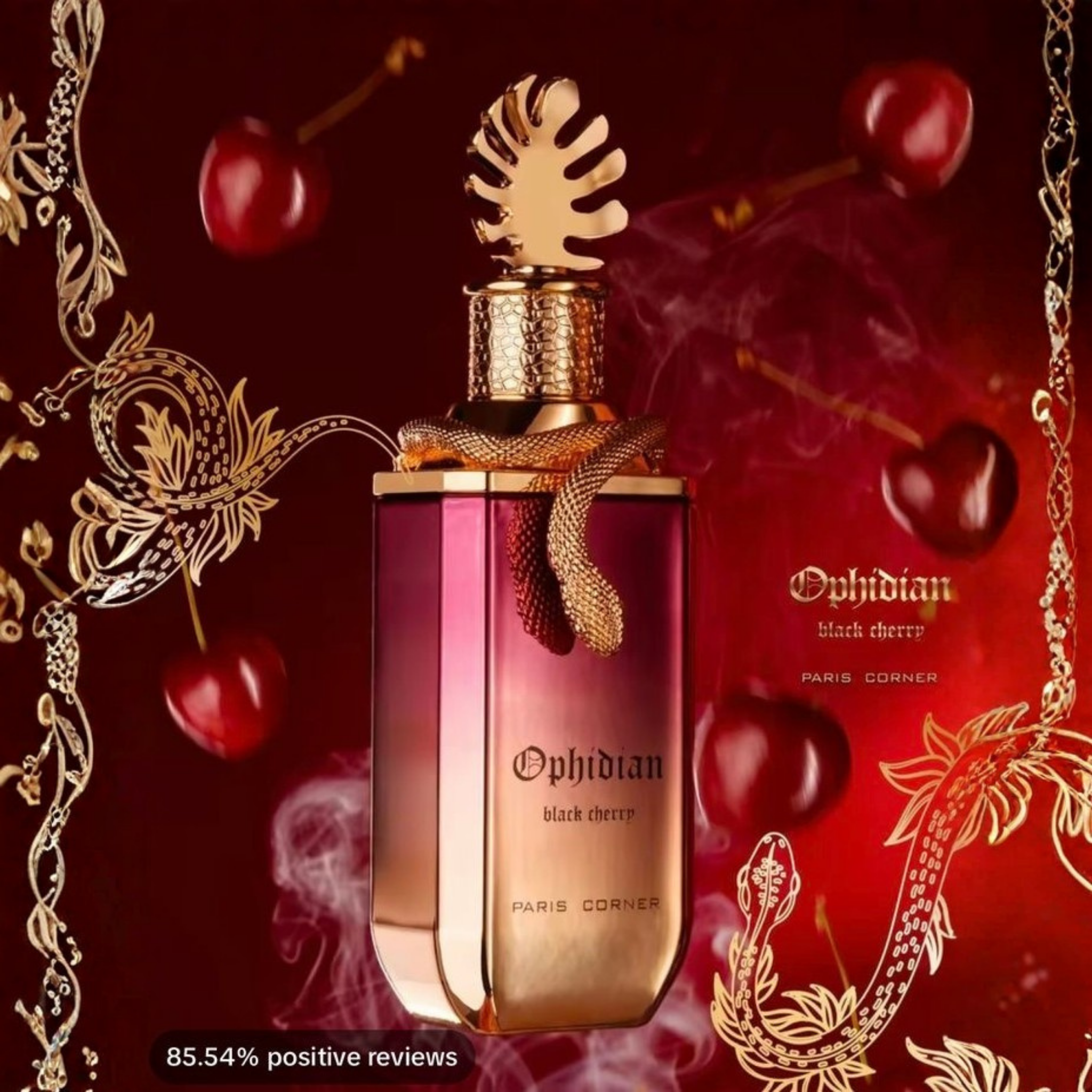 Ophidian Black Cherry by PARIS CORNER is a Woody fragrance for women and men. This is a new fragrance. Ophidian Black Cherry was launched in 2024. Top notes are Raspberry and Bergamot; middle notes are Praline, Damask Rose, Heliotrope and Jasmine; base notes are Guaiac Wood, Palo Santo, Ambrettolide, Tonka Bean, Patchouli, Vetiver and Pear.