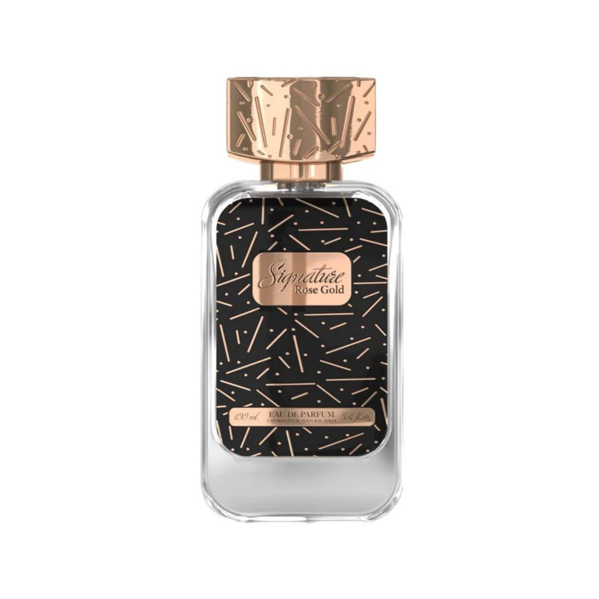 Signature Rose Gold by Dkhoon Emirates is a unisex fragrance introduced in 2023. The composition features aromatic spices, velvety roses, and warm caramel, creating a harmonious blend. The scent opens with notes of orange, saffron, and cinnamon, followed by a heart of caramel, dry amber, jasmine, and rose, and settles on a base of vanilla and tonka.