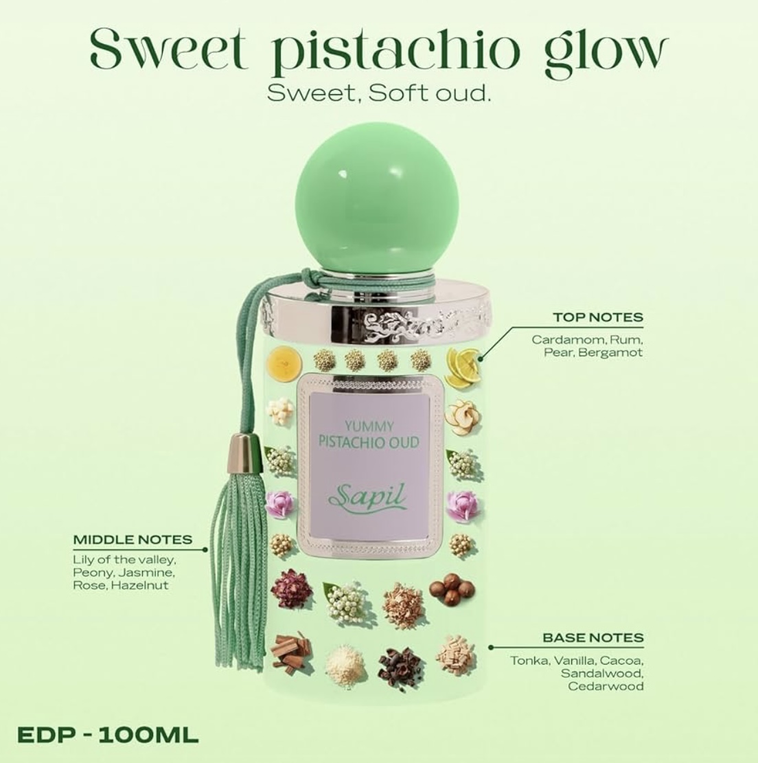 Yummy Pistachio Oud is a fragrant celebration of joy and indulgence. The sweet nuttiness of pistachio blends beautifully with the delicate florals of peony and jasmine, while the gourmand base of vanilla, cocoa, and tonka creates a comforting and addictive finish. This fragrance is the perfect balance of sweet and floral, grounded by the warmth of oud.